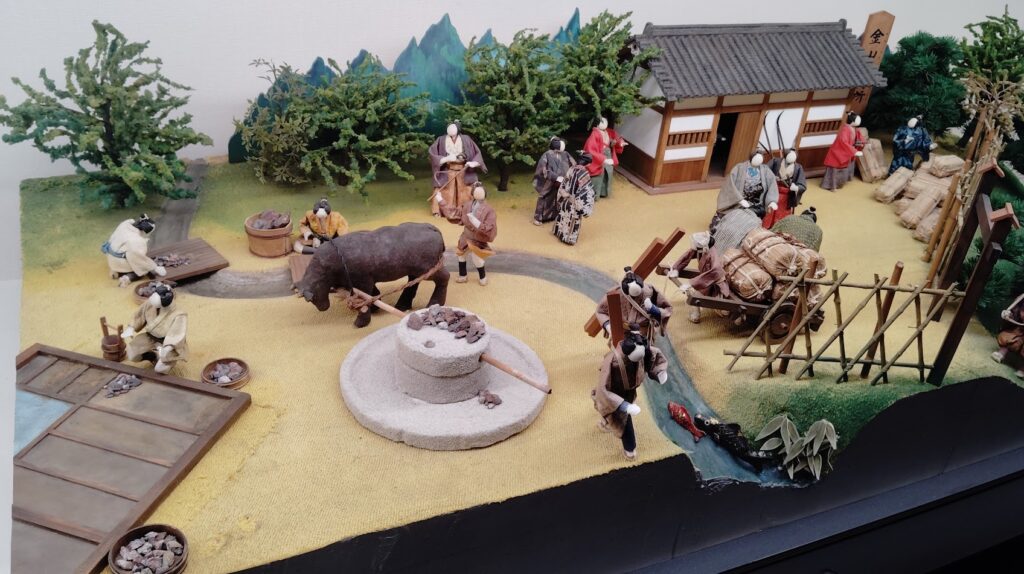 次に、袋の中から火打石を持ち出して火を打ち出している。火打石は、石英の一種の燧石(flint)と、炭素含有の一定程度ある鉄とからなる。打ち合わせたときの衝撃で微小な鉄粉が摩擦熱と酸化熱のために火花となって出るが、着火させるのはなかなか難しい。それでも、袋から火打石を出したところでもはや火は打ち出されていると考えられる。打ち出の小槌ならぬ打ち出の火打である(注5)。