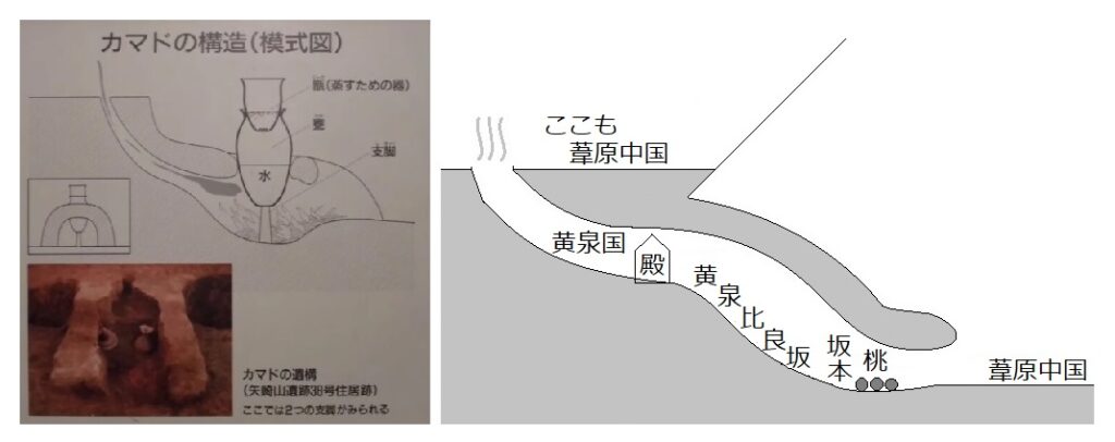 凹部が焦げて使い物にならなくなっていた火鑽臼を竈にくべ、炭化したところに火が移って音を立てて燃え出すさまが活写されている。竈とそれに続く煙道内部の構造を黄泉国の地理によって表している。煙道のつき方具合を表すために「黄泉比良坂」という言い方をし、その奥に続く見えないところはクルル鉤のような曲がりくねりから縢戸のある殿が控えているとする。整理のために図示する。
