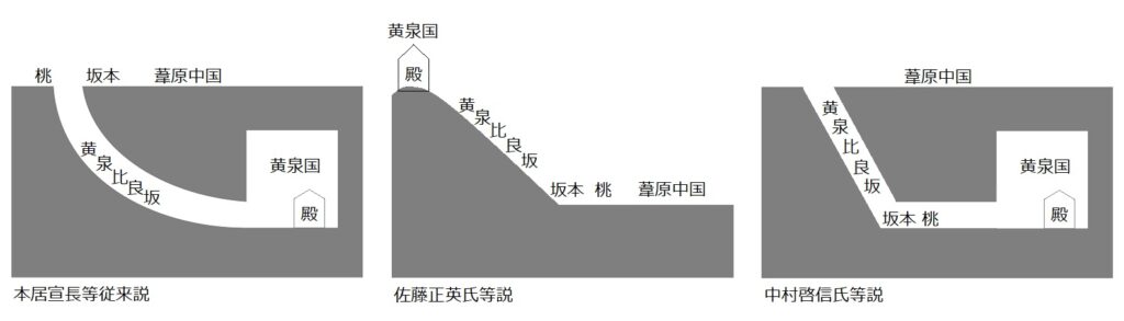 これにより、黄泉国、黄泉比良坂、黄泉比良坂の坂本、そして葦原中国の位置関係は定まる。