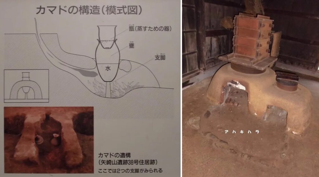 (注11)近代まで続いた竈は竪穴建物から掘立柱建物へ変わったこともあり、煙突を伴わない。設置される場所も壁際に限らず、かなり自由である。煙突を立てれば茅葺き屋根に火の粉がかかり火事になる。茅葺きの燻蒸のためにも煙突がなくて煙が屋内に充満したほうが好都合であった。ただし、焚口付近の様子に大きな変化は見られない。